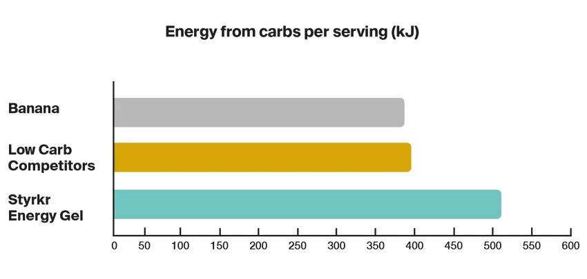 Styrkr drink mixes and gels contain two transportable carbohydrates – maltodextrin and fructose – at a ratio of 1:0.8 to improve the exogenous carbohydrate oxidation rate and cause the least amount of gut discomfort compared to ratios of 1:1.25 and 2:1